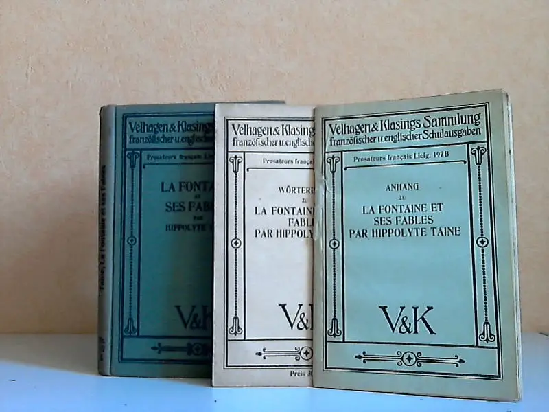 die 3 Büchlein sind ein Dachbodenfund, gebräunt, fleckig, der Leineneinband ist teils ausgeblichen, teils Kantenbestoßungen, Vellhagen und Klasings Sammlung französischer und englischer Schulausgaben. 3 Bücher: 1. La Fontane et ses Fables par Hippolyte Taine. 2. Anhang zu La Fontane et ses Fables par Hippolyte Taine. 3. Wörterbuch zu La Fontane et ses Fables par Hippolyte Taine Beschreibung vom Antiquariat Ardelt 3k6b Antiquariat Ardelt