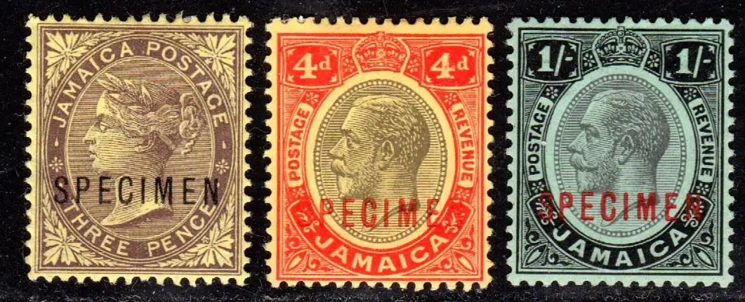 Jamaica 52, 63, 65, ungebr. 3+4d und 1 Sh. je mit SPECIMEN Überdruck