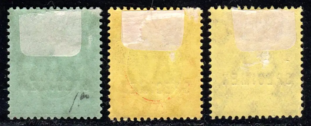 SPECIMEN in rot u. 1x in schwarz auf 3 ungebr. Marken m. Originalgummi und Falzresten