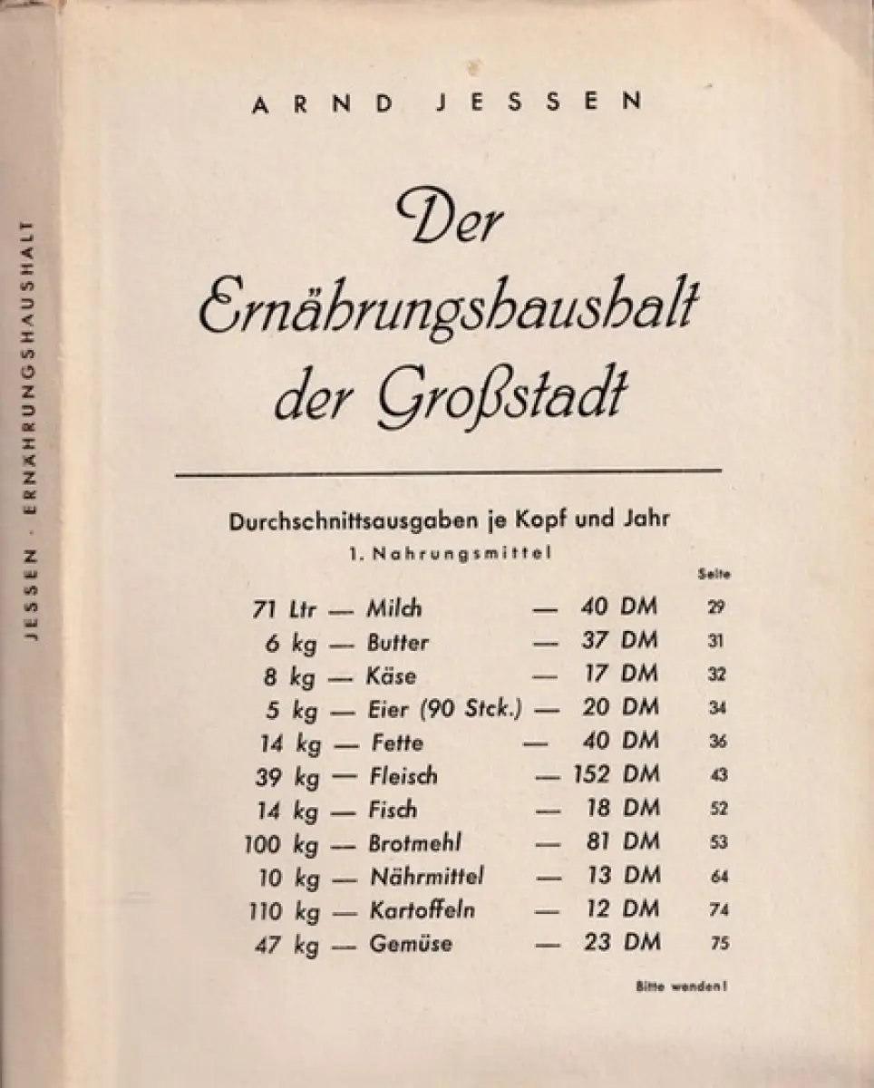 21 x 14,8 cm. Original-Broschur im Schutzumschlag. Der Umschlag mit Randeinriss hinten von ca. 1,2 cm und leichten Gebrauchsspuren. VIII, 144 Seiten mit Auflistung von Gesamteinkommen, Ernährungsbedarf, Ausgaben am Beispiel von West-Berlin u.a..mit etlichen Tabellen im Text. Innen nur leicht gebräunt. Gutes Exemplar