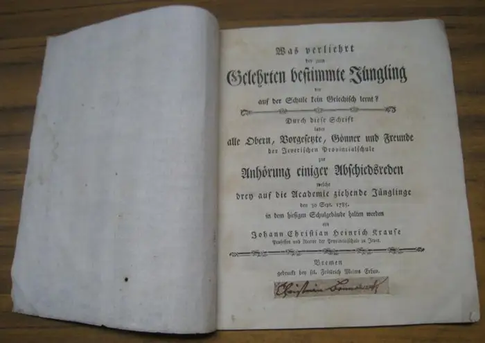 Titel: Was verliehrt der zum Gelehrten bestimmte Jüngling der auf der Schule kein Griechisch lernt ? Durch diese Schrift ladet alle Obern, Vorgesetzte, Gönner und Freunde der Jeverischen Provincialschule zur Anhörung einiger Abschiedsreden welche drey auf die Academie ziehende Jünglinge den 30. Sept. 1785 in dem hiesigen Schulgebäude halten werden ein Johann Christian Heinrich Krause