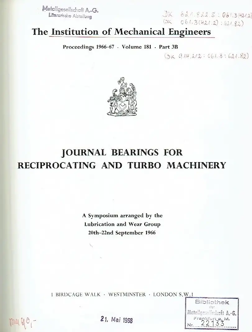 Journal Bearings for Reciprocating and Turbo Machinery A Symposium arranged by the Lubrication and Wear Group ... 1966.