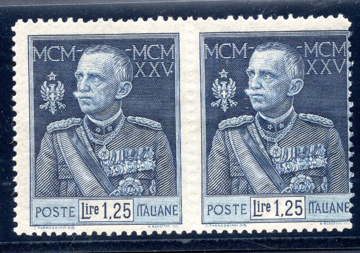 Jubiläum des Königs Lire 1 Paar mit Blindverzahnung Mit Linguella Spur - Jubiläum des Königs Lire 1 Nr. 187 horizontales Paar mit vertikaler Verzahnung in der Mitte gerade erwähnt (Blindbohrung) - Selten Code 262/11