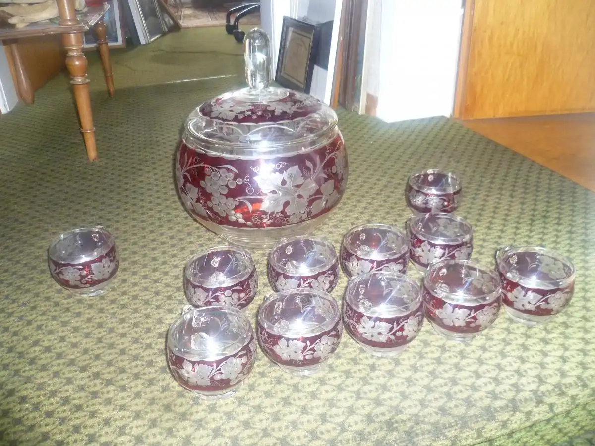 Jugendstil Kristall Rose überfangenes Bowle Set Böhmen um 1900 für 11 Personen ,