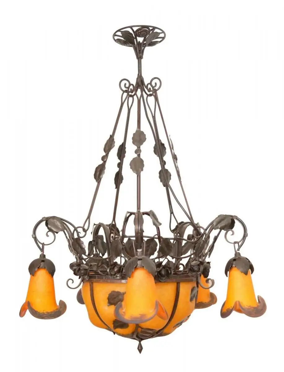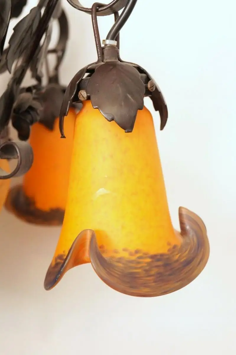 Lampe de plafond en acier inoxydable, hauteur totale d'environ 100 cm, éclairage de plafonds en fer forgé, grande et somptueuse Art nouveau, avec des verres de Pate de Verre. Env. années 1990 - pas antique - veuillez noter! Monture en fonte forgeable très élégante, anodisée noire avec signes d ' âge et d ’ utilisation. Verre moyen soufflé - non amovible. Cinq verres tulipes - effet de lumière fantastique. Hauteur totale env