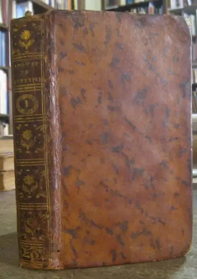 17 x 10 cm. Tome Premier. Plein-veau de l'époque avec le dos orné en or. Les pièces liminaires marbrées. XII pages Préface, 420 pages texte, de cela 17 pages Proemium et les livres I - XXVI, pages 406 - 420 Table des Matières, avec quelques vignettes de Tete et une petite vignette de titre. Le dos avec petite manque au-dessus, avec quelques frottements, les bords et les coins un peu endommagés. La page 15/16 du Proemium endommagée sans perte de texte. Légère odeur de tabac. Encore en bon état. - 1. Band: Ganzleder der Zeit, der Rücken goldverziert, die Vorsätze marmoriert. XII Seiten Vorwort, 420 Seiten, davon 17 Seiten Proemium, die Bücher 1-26 und das Inhaltsverzeichnis auf den Seiten 406-420. Der übersetzte Text der Institutionen mit Gegenüberstellung des französischen Rechts. Mit einigen Kopfvignetten und einer kleinen Titelvignette. Der Rücken mit Fehlstelle oben, der Einband mit etwas Abrieb, die Ecken bestoßen. Seite 15/16 des Proemium mit unterem Abriss ohne Textverlust. Schwacher Anflug von Tabakgeruch. Gutes Exemplar
