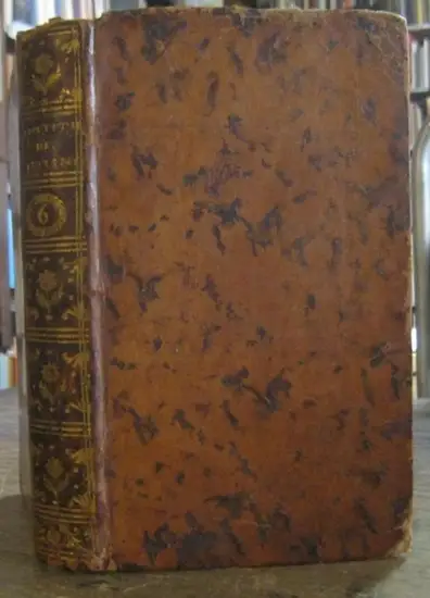 Freie Beschreibung: 17 x 10 cm. Tome Sixième. Plein-veau de l'époque avec le dos orné en or. Les pièces liminaires marbrées. Suite du Livre IV avec les Titres VI - XXVIII avec 445 pages, de cela pages 435 - 445 Table des Matières. avec quelques vignettes de Tete et une petite vignette de titre. Le dos avec une manque au-dessus, avec quelques frottements aux bords, les coins un peu endommagés. Sur la page de garde une notice du nom en encre vielle: Dullin. Légère odeur de tabac. Encore en bon état. - 6. Band: Ganzleder der Zeit, der Rücken goldverziert, die Vorsätze marmoriert. Fortsetzung des Buches IV mit 445 Seiten, den Titeln 6 -28 und auf den Seiten 435 - 445 Inhaltsverzeichnis. Der übersetzte Text der Institutionen mit Gegenüberstellung des französischen Rechts. Mit einigen Kopfvignetten und einer kleinen Titelvignette. Der Rücken oben mit Fehlstelle, der Einband an den unteren Ecken bestoßen. Auf dem Vortitel kurzer Namenszug in alter Tinte: Dullin 1792. Schwacher Anflug von Tabakgeruch. Gutes Exemplar