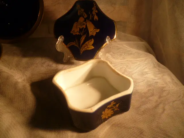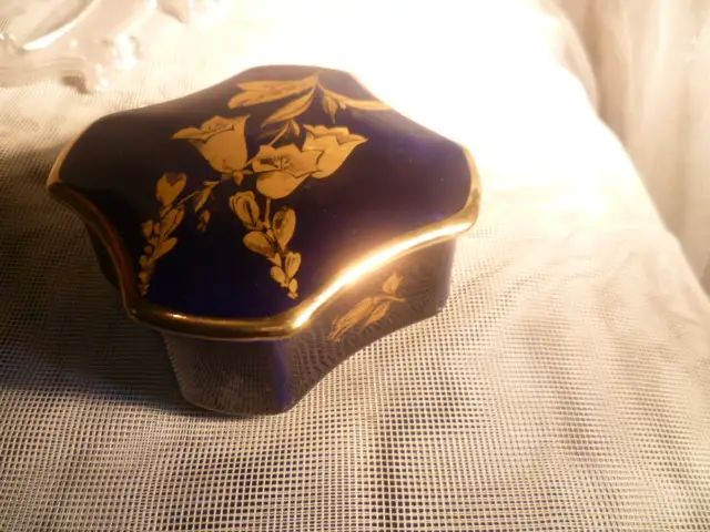 KPM Royal Porzellan Deckeldose / Schmuckdose 4 eckiger eingezogener Körper Goldmalerei 8x 8 x 4,5 aus der Vitrine