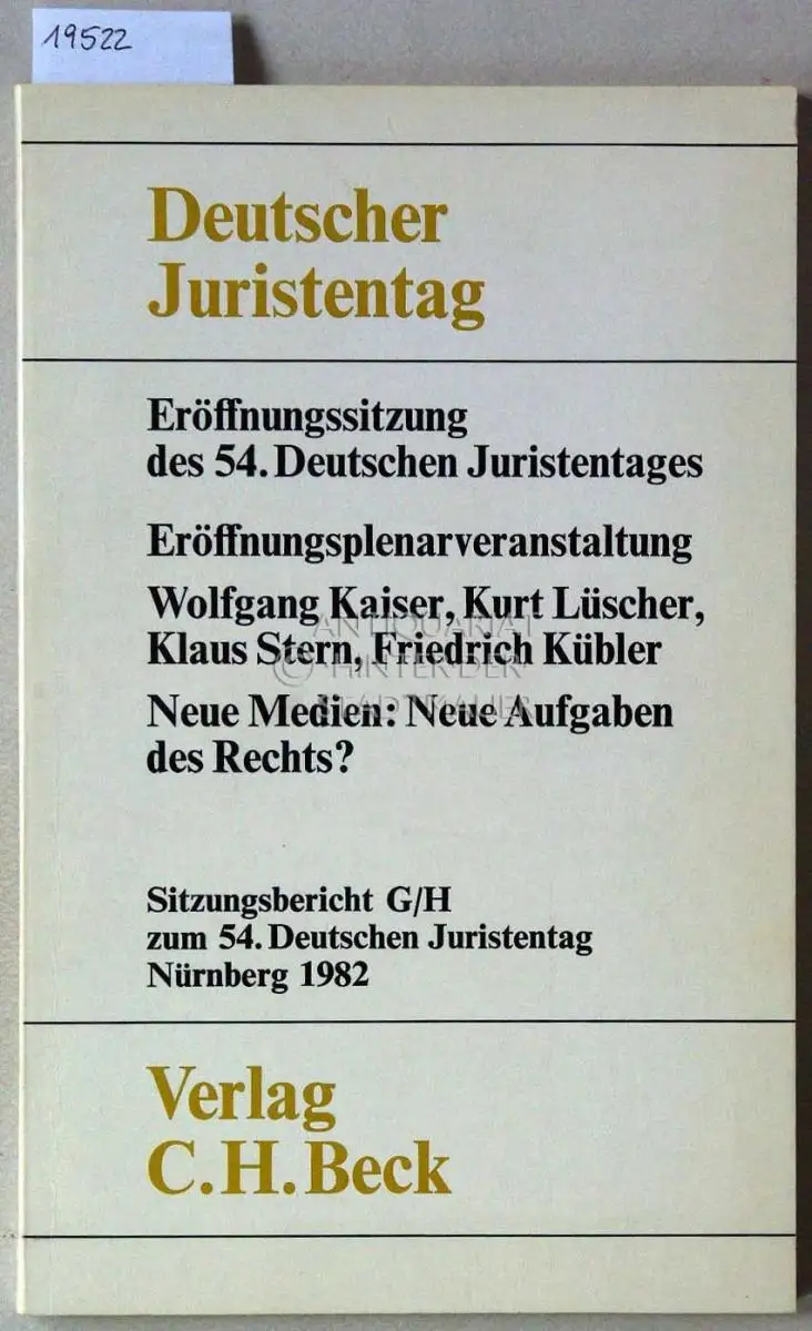 Kaiser, Wolfgang, Kurt Lüscher Klaus Stern u. a: Eröffnungssitzung des 54. Deutschen Juristentages. Eröffnungsplenarveranstaltung. Neue Medien: Neue Aufgaben des Rechts? [= Sitzungsbericht G/H zum 54. Dt. Juristentag] Deutscher Juristentag e.V.