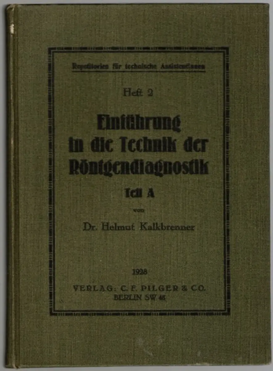 Kalkbrenner, Helmut: Einführung in die Technik der Röntgendiagnostik. Teil A. [= Repetitorien für technische Assistentinnen ; Heft 2] Berlin, Verlag C. F. Pilger & Co., 1928.