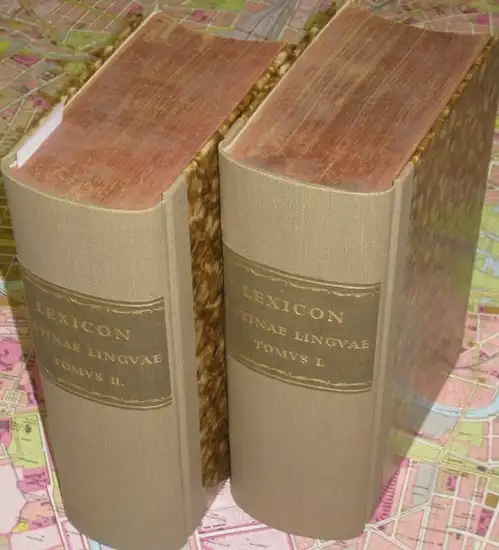 Freie Beschreibung: Gr.-8°. Zwei uniforme, neuere Halbleinenbände mit silbergeprägten Rückentiteln auf Rückenschildern. Dreiseitenrotschnitte. Frontispiztafel, 4 Seiten Titel und Vorrede, 4944 fortlaufend paginierte Spalten, zweispaltig gesetzt; 4 Seiten Anzeigen, eine gefaltete Tabelle: Eduardi Bernardi Tabula alphabetica literarum Latinarum. Wenig gebräunt, sauber, fest in der Bindung. Gutes Exemplar