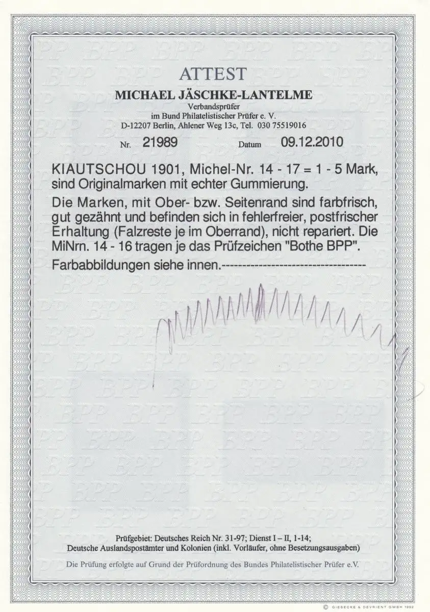 Kiaoutchou: Min. 14-17, frais post-martin (haute-rande Falz), BPP Attest