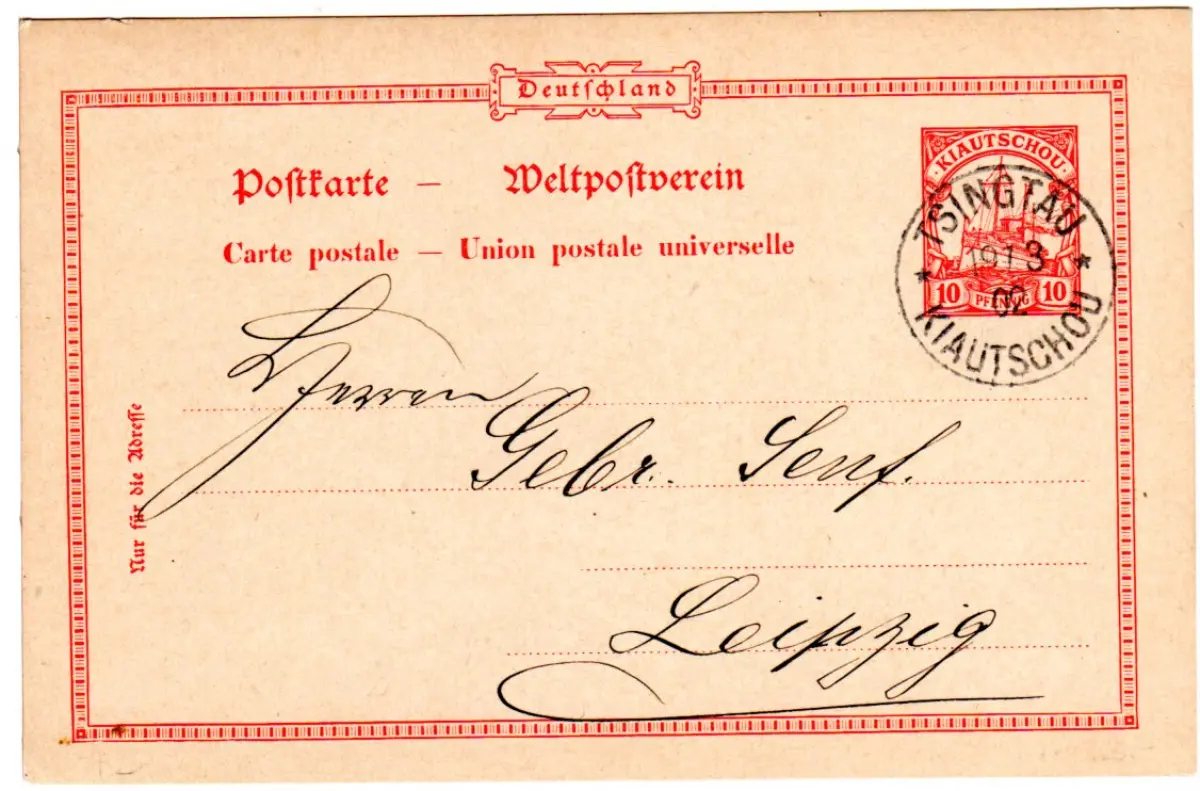 Kiautschou P2, sauber m. K1 Tsingtau gestempelte 10 Pf. Ganzsache