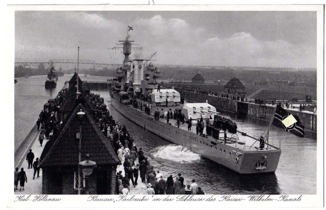 Kreuzer Karlsruhe m. Hakenkreuzfahne (Hoheitszeichen f. scan abgedeckt) i.d. Schleuse des Kaiser-Wilhelm-Kanals.