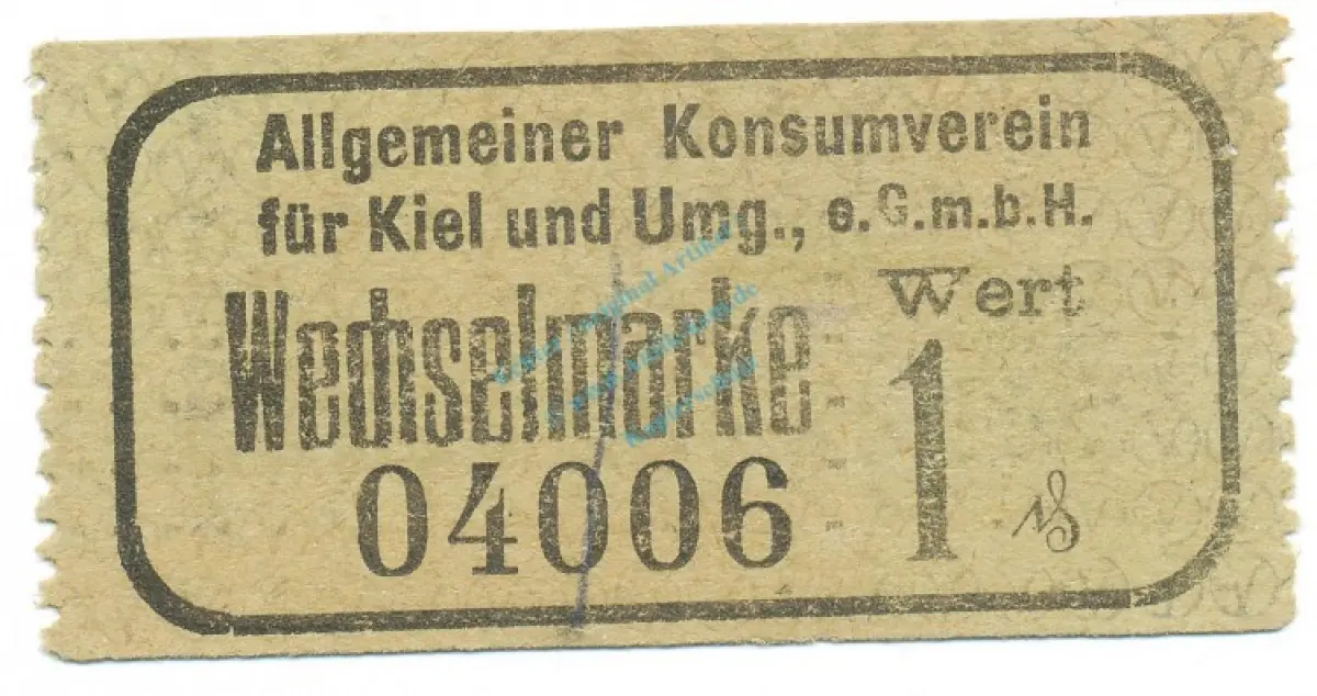 Kiel , Notgeld 1 Pfennig Schein unc-kfr. Tieste 3470.05.15 , Schleswig o.D. VerkehrsausgabeWechselmarke, Gutschein : Allgemeiner Konsumverein für Kiel und Umgebung e.G.m.b.H