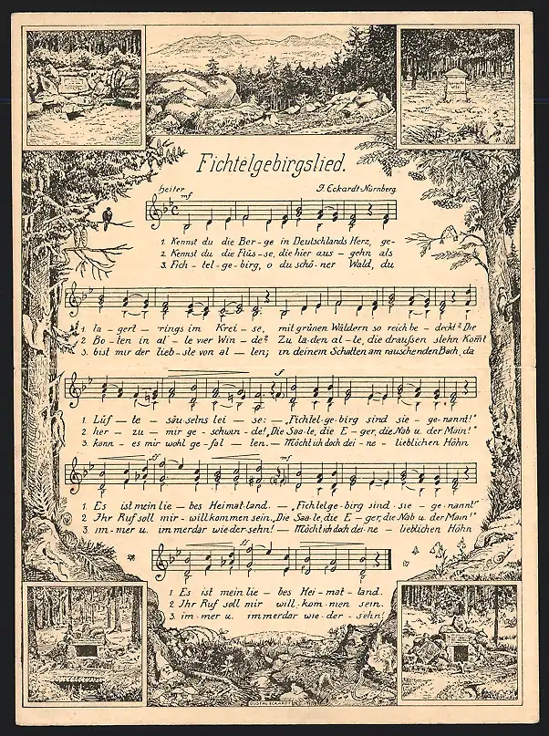 Klapp-AK Fichtelgebirgslied von J. Eckardt, Liedtext und Noten, Partien im Wald