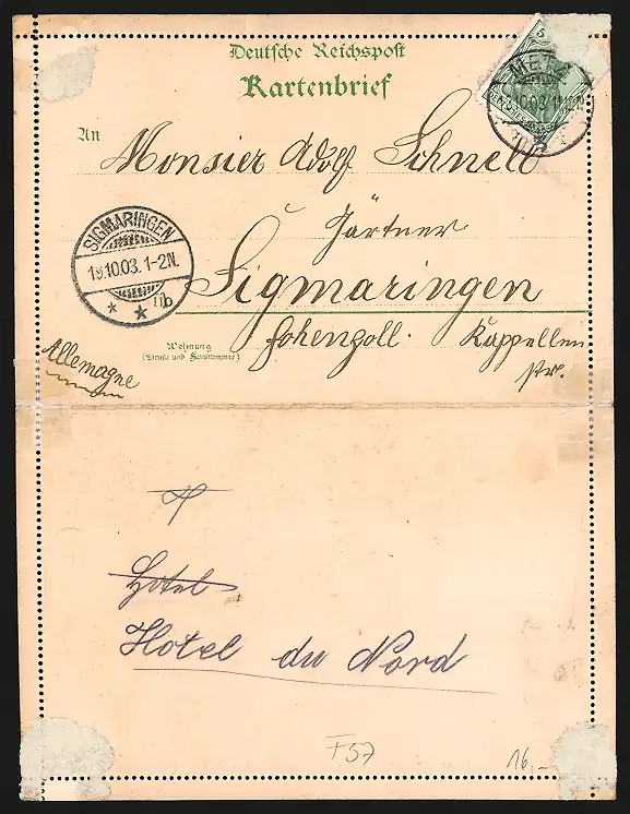 gelaufen 1903, rückseitig Klebe- und Papierreste, eingerissener Falz, Bugspur oben mittig, guter Zustand