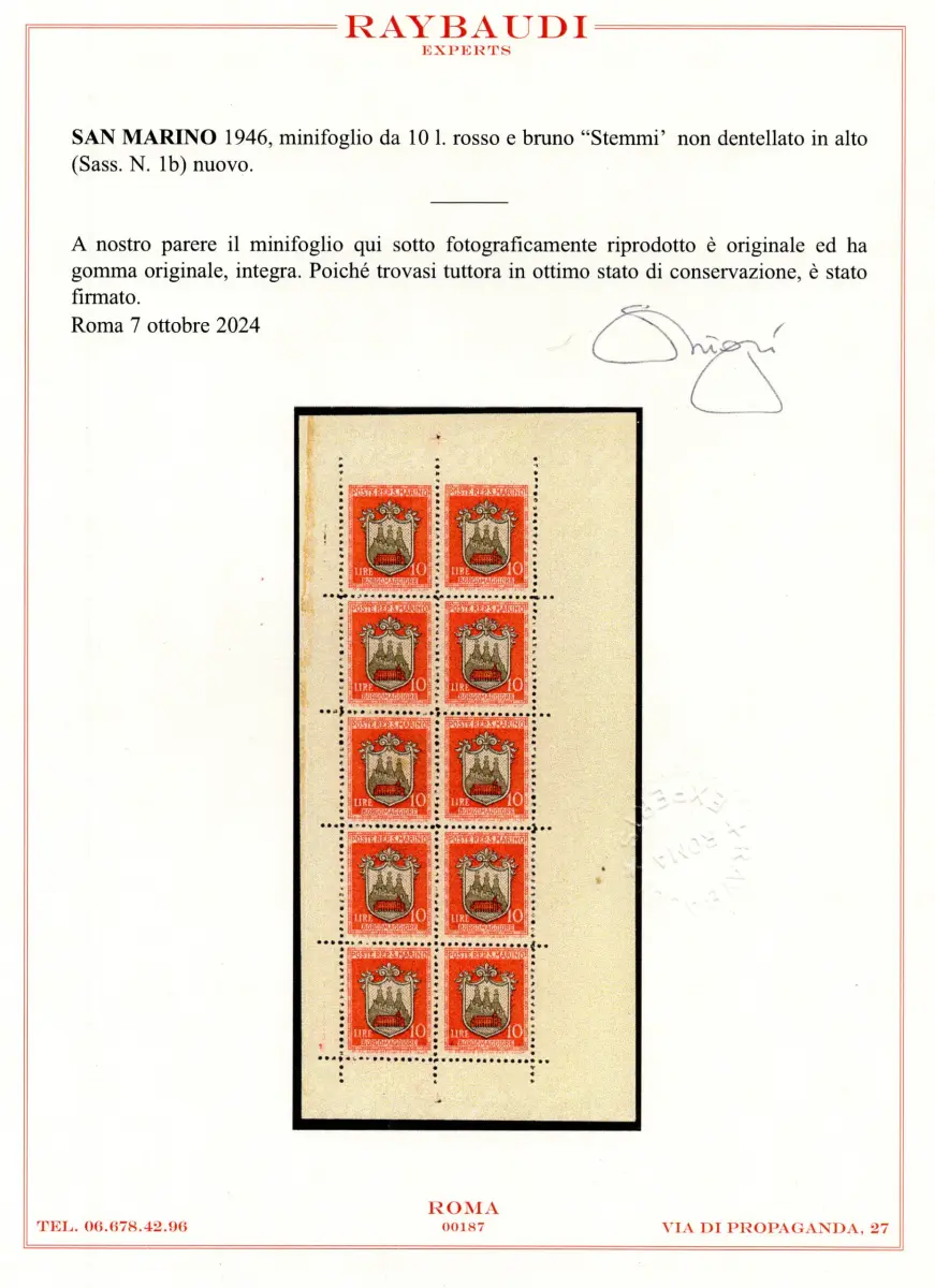 MNH - Vollgummi - - Wappen Lire 10 - Kleinbogen mit zehn Nr. 1b mit den ersten beiden ungezahnten Exemplaren oben - sehr guter Erhaltungszustand, perfekt mit Vollgummi - Selten, Raybaudi Zertifikat Cod. 2486/WEB
