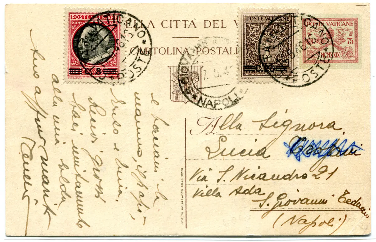 König des Mai - Postkarte ab Cent. 75 aus Vatikanstadt AK - König im Mai - Postkarte aus Cent. 75 verschickt von Vatikanstadt nach Neapel am 14.5.46 mit zusätzlichem Postfrankatur. Nr. 103 + 106 - Selten, für Spezialisten Cod. 250/16