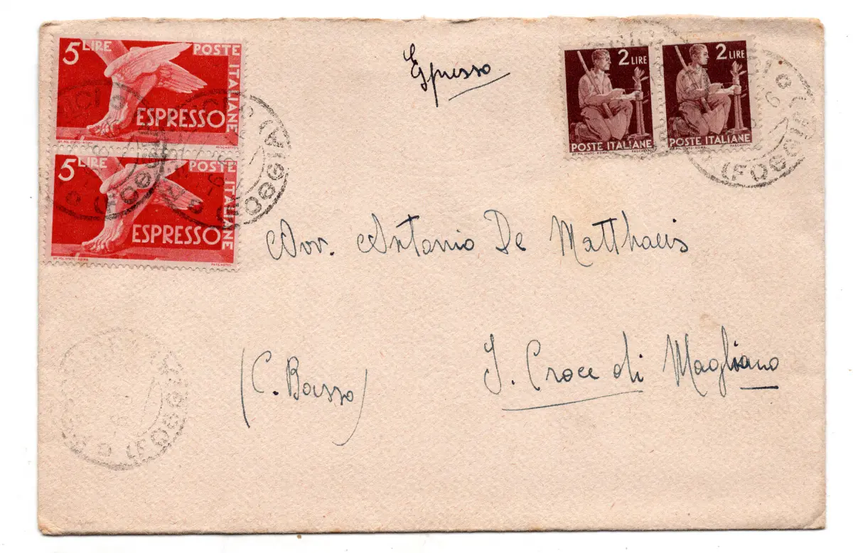 Umschlag - 6. Juni 1946 - Express-Reiseumschlag von Peschici nach S. Kreuz Frankatur im Demokratischen Tarif Lire 2 x 2 + Espresso Lire 5 x 2 Katalog EuroN.C. Cod.2252/WEB
