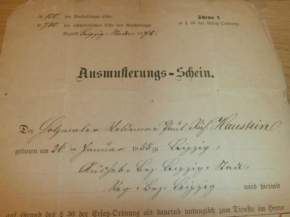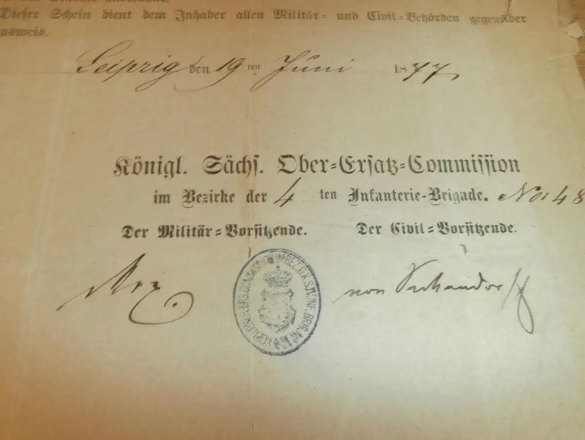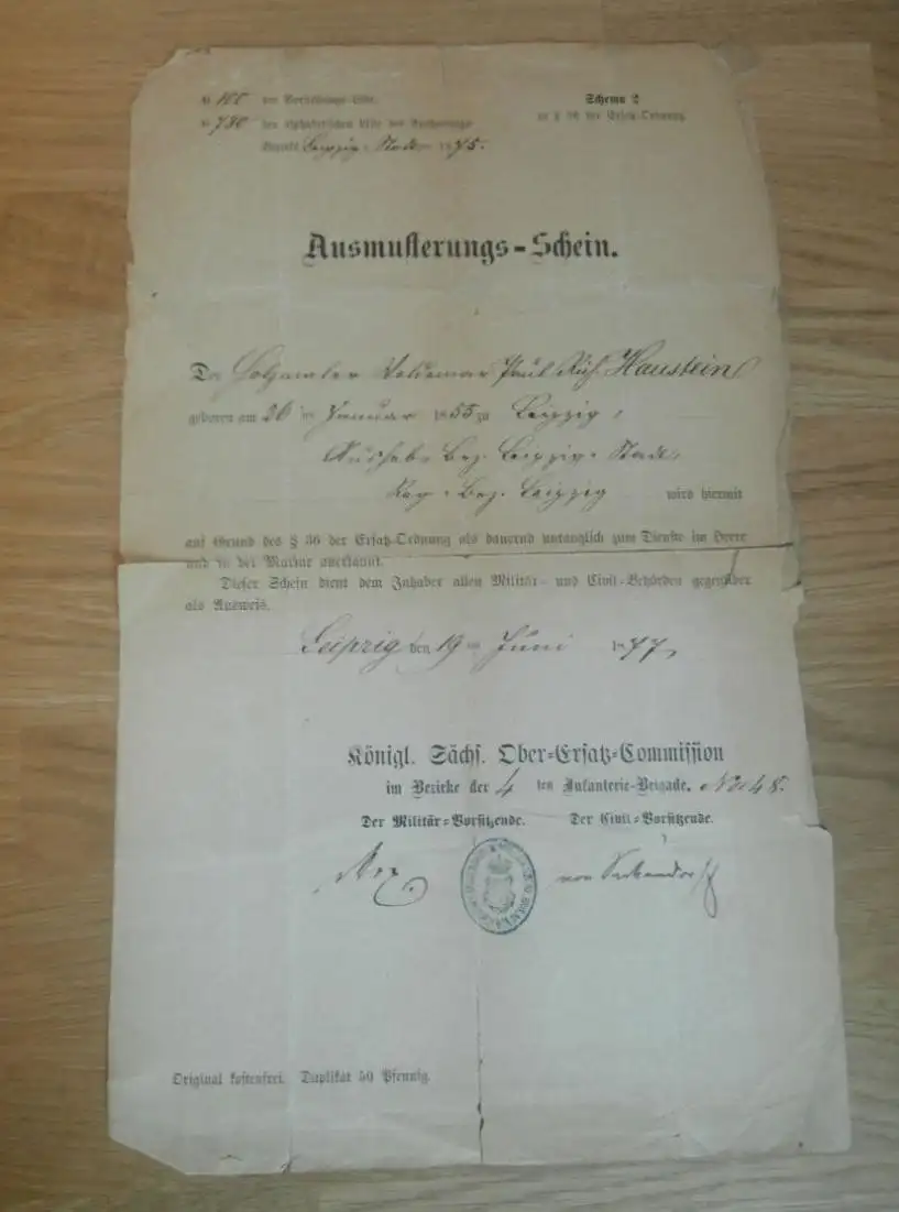Königl. Sächsische Ober-Ersatz-Commision , 1877 , Paul Haustein in Leipzig - Ausmusterungs-Schein , Militär Dokument !!