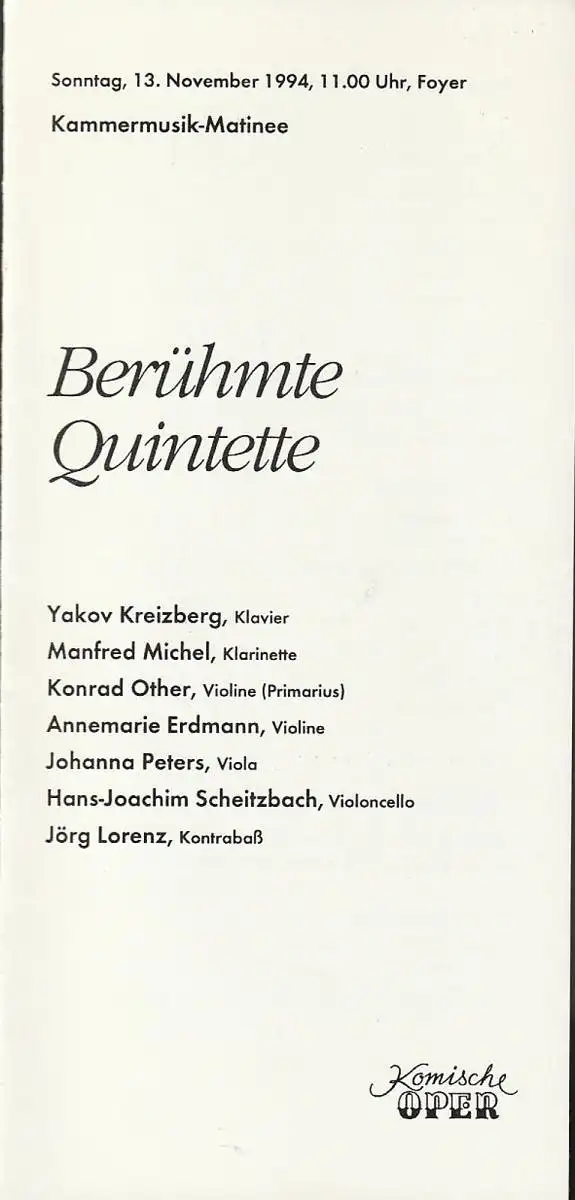 Titel: Programmheft BERÜHMTE QUINTETTE 13. November 1994 Kammermusik-Matinee Foyer Komische Oper Spielzeit 1993 / 94
