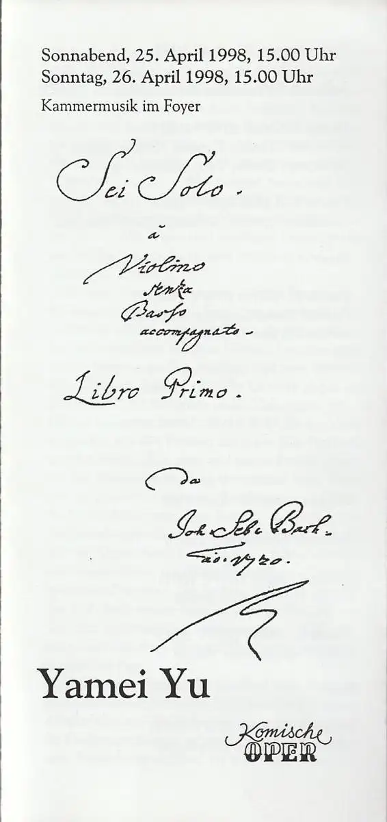 Programm am 25. April 1998: JOHANN SEBASTIAN BACH: Partita I h-Moll ( BWV 1002 ). Partita II d-Moll ( BWV ). Partita III E-Dur ( BWV 1006 ). Programm am 26. April 1998: JOHANN SEBASTIAN BACH: Sonate I g-Moll ( BWV 1001 ). Sonata II a-Moll ( BWV 1003 ). Sonate III C-Dur ( BWV 1005 ) - Theaterprogramm, Opernprogramm, Ballettprogramm, Musicalprogramm, Konzertprogramm, Theatermemorabilia, Programmhefte Sammlung, deutsche Theatergeschichte.