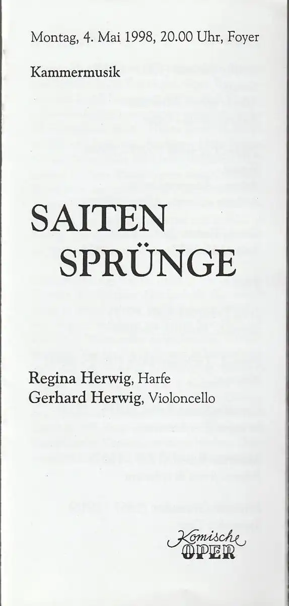 Titel: Programmheft KAMMERMUSIK SAITEN-SPRÜNGE REGINA HERWIG / GERHARD HERWIG 4. Mai 1998 Foyer Komische Oper