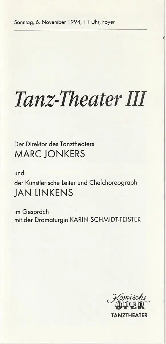 Titel: Programmheft TANZ - THEATER III 6. November 1994 Foyer Komische Oper