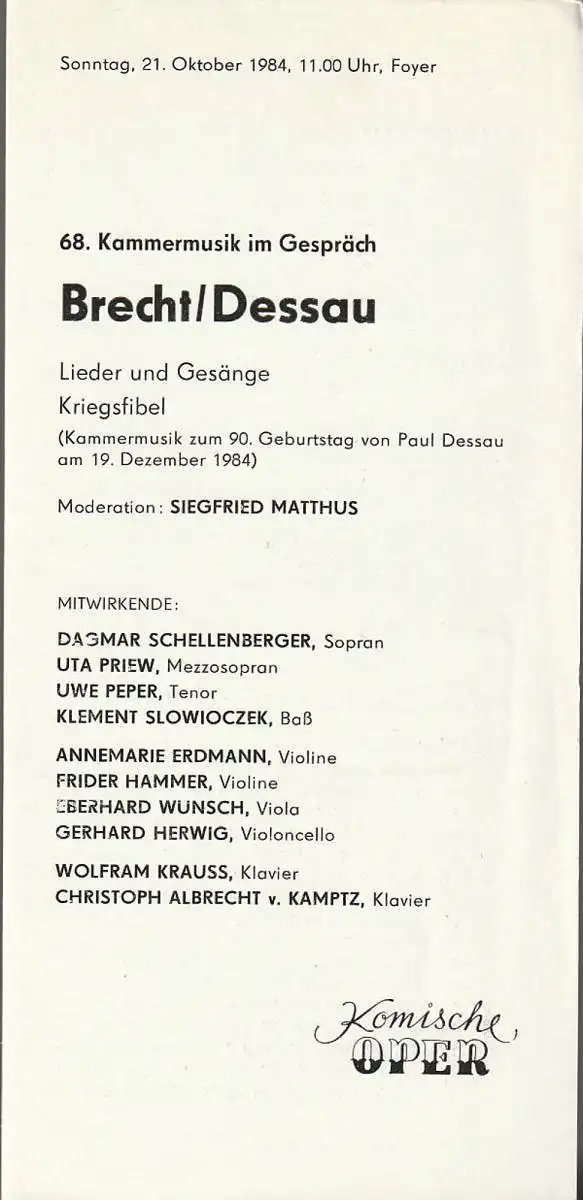 Komische Oper Berlin, Gerhard Müller: Programmheft 68. KAMMERMUSIK IM GESPRÄCH BRECHT / DESSAU LIEDER UND GESÄNGE KRIEGSFIBEL 21. Oktober 1984 Foyer Komische Oper Spielzeit 1984 / 85.