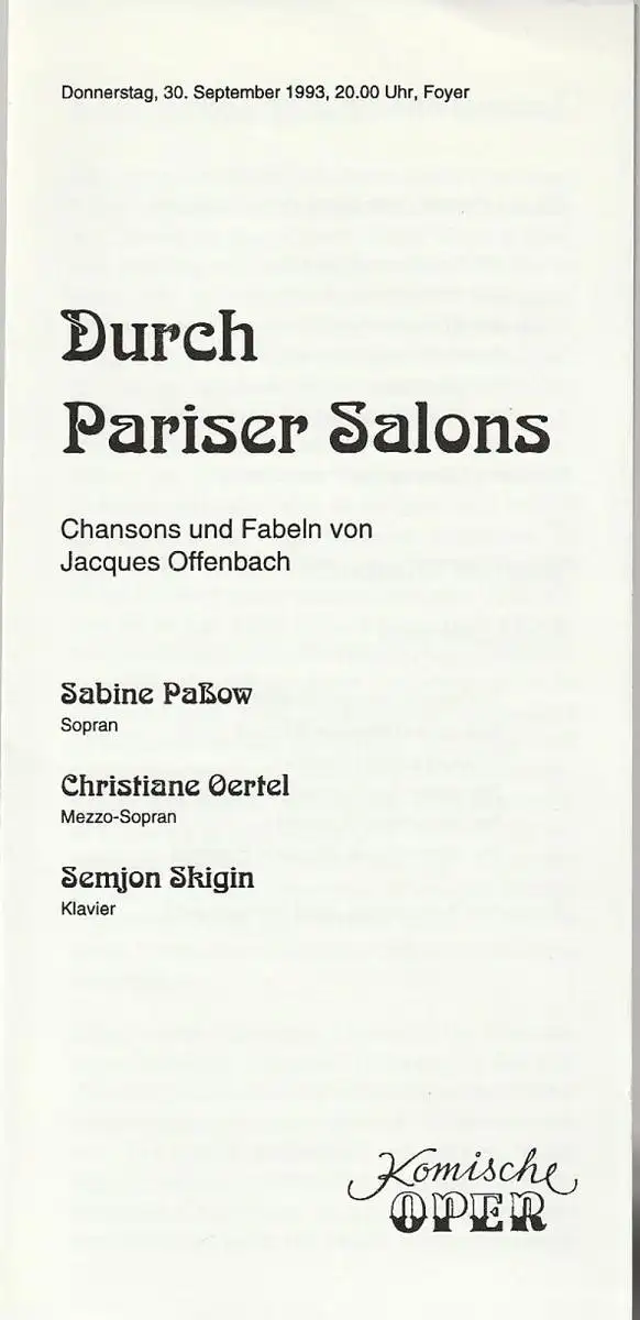 Titel: Programmheft DURCH PARISER SALONS Chansons und Fabeln von Jacques Offenbach 30. September 1993 Foyer Komische Oper Spielzeit 1993 / 94