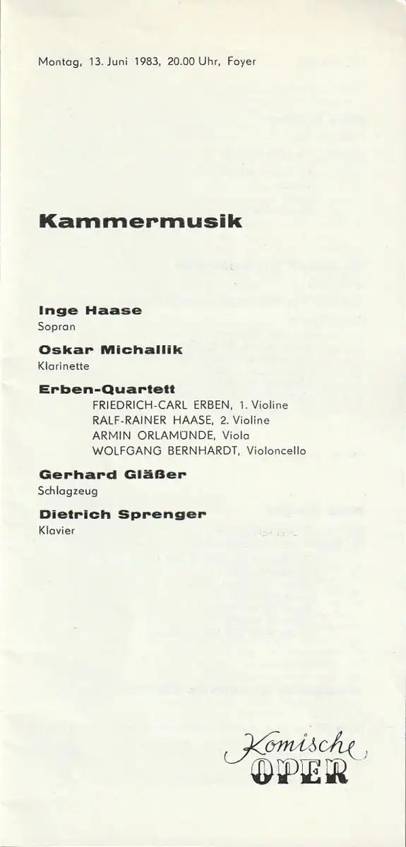 Komische Oper Berlin, Gerhard Müller: Programmheft KAMMERMUSIK 13. Juni 1983 Foyer Komische Oper Spielzeit 1982 / 83.