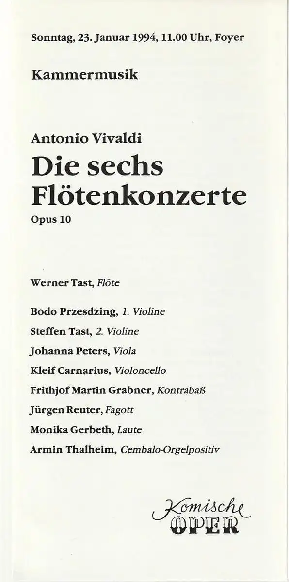 Komische Oper Berlin, Gerhard Müller: Programmheft KAMMERMUSIK Antonio Vivaldi DIE SECHS FLÖTENKONZERTE Opus 10 23. Januar 1994 Foyer Komische Oper Spielzeit 1993 / 94.