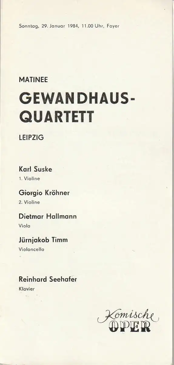 Komische Oper Berlin, Gerhard Müller: Programmheft MATINEE GEWANDHAUS - QUARTETT LEIPZIG 29. Januar 1984 Foyer Komische Oper Spielzeit 1983 / 84.