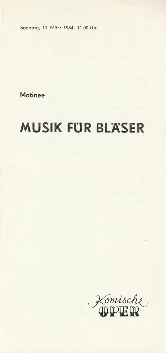 Titel: Programmheft MATINEE MUSIK FÜR BLÄSER 11. März 1984 Komische Oper Berlin