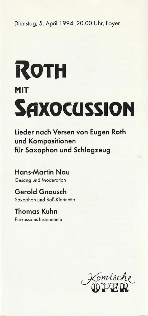 Komische Oper Berlin, Gerhard Müller: Programmheft ROTH MIT SAXOCUSSION 5. April 1994 Foyer Komische Oper Spielzeit 1993 / 94.