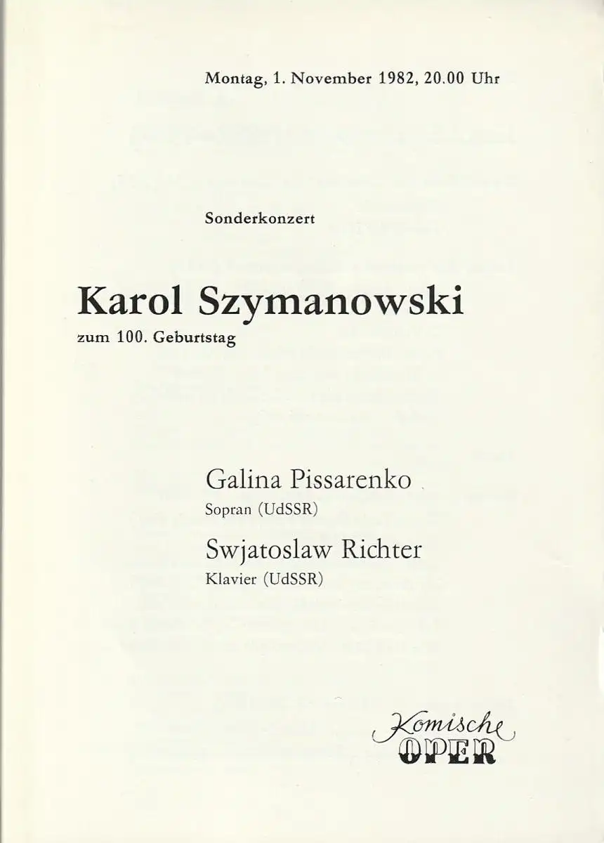 Karol Szymanowski zum 100. Geburtstag. Mitwirkende: Galina Pissarenko, Sopran / Swjatoslaw Richter, Klavier. Programm: KAROL SZYMANOWSKI: Zwei Stücke aus Masken für Klavier, op. 34. Lieder des verliebten Muezzins, op. 4. Sieben Lieder nach James Joyce, op. 54 . Dritte Sonate für Klavier, op. 36 - Schlüsselwörter: Theaterprogramm, Opernprogramm, Ballettprogramm, Musicalprogramm, Konzertprogramm, Theatermemorabilia, Programmhefte Sammlung, deutsche Theatergeschichte.