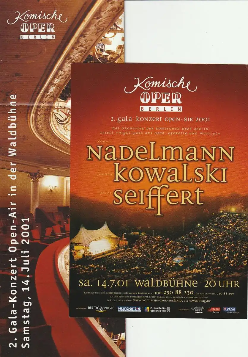 Orchester der Komischen Oper. Dirigent: Yakov Kreizberg. Solisten: Noemi Nadelmann, Sopran / Jochen Kowalski, Altus / Peter Seiffert, Tenor. Progarmm: Highlights aus Oper, Operette und Musical. Stücke von Mozart, Händel, Monteverdi, Mussorgski, Rimski-Korsakow, Wagner,Verdi, Giordano, Smetana, Bernstein, Johann Strauss, Jary, u. a. - Theaterprogramm, Opernprogramm, Ballettprogramm, Musicalprogramm, Konzertprogramm, Theatermemorabilia, Programmhefte Sammlung, deutsche Theatergeschichte.