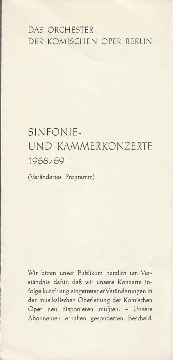Komische Oper Berlin: Programmheft SINFONIE - und KAMMERKONZERTE DES ORCHESTERS DER KOMISCHEN OPER 1968 / 69.