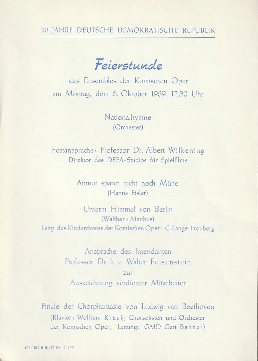 Programm: Nationalhymne, Festansprache Albert Wilkening, Werke von Hanns Eisler und Walther / Matthus, Ansprache des Intendanten Walter Felsenstein, Auszeichnung verdienter Mitarbeiter, Finale der Chorphantasie von Ludwig van Beethoven. Klavier: Wolfgang Krauß, Chorsolisten und Orchester der Komischen Oper. Leitung: Gert Bahner. - Theaterprogramm, Opernprogramm, Ballettprogramm, Musicalprogramm, Konzertprogramm, Theatermemorabilia, Programmhefte Sammlung, deutsche Theatergeschichte.