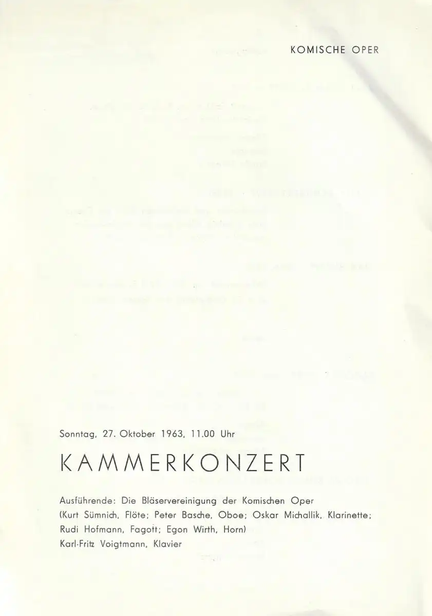 Ausführende: Die Bläserverinigung der Komischen Oper ( Karl Sümnich, Flöte / Peter Basche, Oboe / Oskar Michallik, Klarinette / Rudi Hofmann, Fagott / Egon Wirth, Horn / Karl-Fritz Voigtmann, Klavier ). Programm: KARL STAMITZ: Quartett Es-Dur, op. 8 Nr. 2 fü Oboe, Klarinette, Horn und Fagott. FRANZ SCHUBERT: Introduktion und Variationen über ein Thema aus den Müller.Liedern ( op. 25 ) für Flöte und Klavier, op. 160. MAX BUTTING: Bläserquintett op. 30 in einem Satz. JACQUES IBERT: Trois pieces breves für Flöte, Oboe, Klarinette, Horn und Fagott. NIKOLAI A. RIMSKI-KORSAKOW: Quintett B-Dur für Flöte, Klarinette, Horn, Fagott und Klavier - Theaterprogramm, Opernprogramm, Ballettprogramm, Musicalprogramm, Konzertprogramm, Theatermemorabilia, Programmhefte Sammlung, deutsche Theatergeschichte.