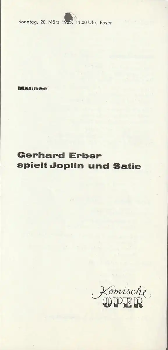 Komische Oper, Gerhard Müller: Programmheft GERHARD ERBER SPIELT JOPLIN UND SATIE 20. März 1983 Matinee im Foyer Komische Oper Spielzeit 1982 / 83.