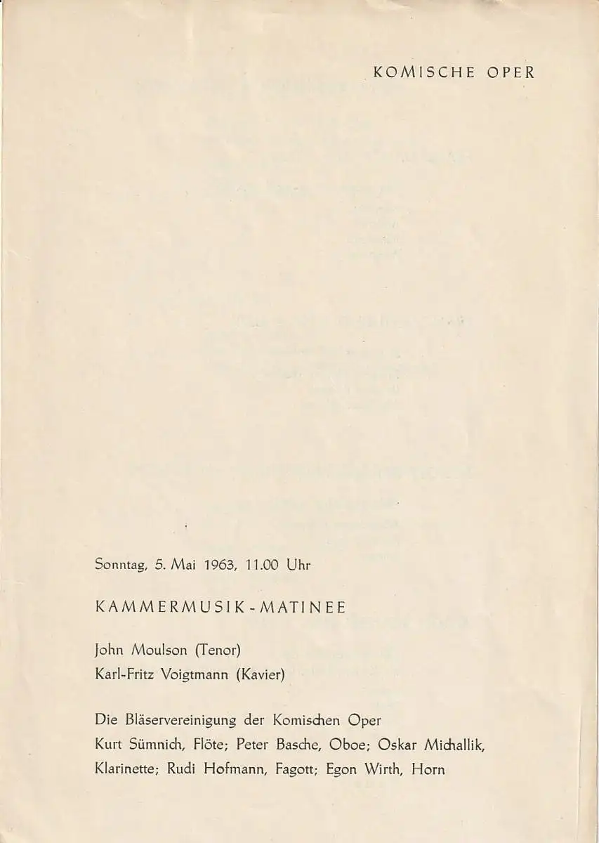 John Moulson, Tenor / Karl-Fritz Voigtmann, Klavier. Die Bläservereinigung der Komischen Oper: Kurt Sümnich,Flöte / Kurt Basche, Oboe / Oskar Michallik, Klarinette /Rudi Hofmann, Fagott / Egon Wirth, Horn. Programm: FRANZ DANZL: Bläserqiuntett g-Moll, op. 56. FRANZ SCHUBERT: 3 Lieder, 2 Ständchen und Fischermädchen. RUDOLF BLEY: Bläserquiuntett 1955. ALBERT ROUSSEL: Divertissement op. 6 für Klavier, Flöte, Oboe, Klarinette, Horn und Fagott. GIOACCHINO ROSSINI: Quartett Nr. IV in B-Dur für Flöte,Klarinette, Fagott und Horn. WOLFGANG AMADEUS MOZART: Quintett Es-Dur KV 452 für Kalvier, Oboe, Klarinette, Horn und Fagott - Schlüsselwörter: Theaterprogramm, Opernprogramm, Ballettprogramm, Musicalprogramm, Konzertprogramm, Theatermemorabilia, Programmhefte Sammlung, deutsche Theatergeschichte.