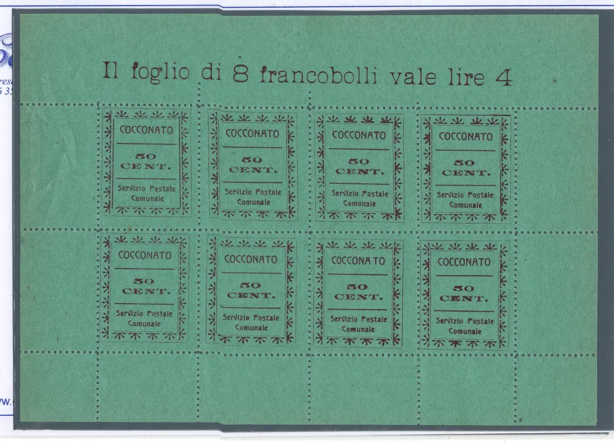 M - ohne Gummi - Kommunale Post von Cocconato (Kat. Einheits-Nr. 2) Bogen mit acht Exemplaren neu einwandfrei - Selten, extrem unterbewertet aus dem Einheitskatalog - Kat. euro 1200 Cod. 2889/WEB