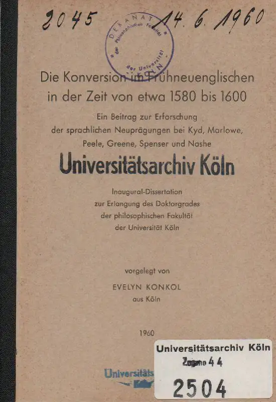 Konkol, Evelyn: Die Konversion im Frühneuenglischen in der Zeit von etwa 1580 bis 1600: ein Beitrag zur Erforschung der sprachlichen Neuprägungen bei Kyd, Marlowe, Peele, Greene, Spenser und Nashe. (Dissertation).