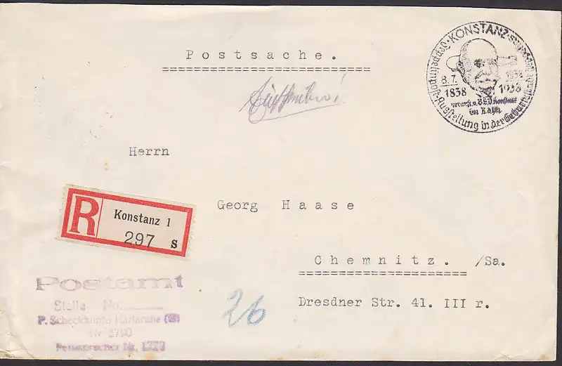 Konstanz SSt. Zeppelin-Ausstellung, 8.7.38, R-Brief als Postsache