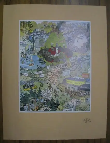 Freie Beschreibung: Farbiges Doppelblatt aus stärkerem Papier in der Größe 47,5 x 30 cm mit einem montierten, farbigen Druck einer Zeichnung von Hans Kossatz im Format 32 x 25 cm. Innen montiert ein weiteres Doppelblatt, vorderseitig bedruckt mit zur Zeichnung passenden, humorvollen Versen bestehend aus drei unbetitelten Sechszeilern von Curth Flatow ( Verfasser von Striptease im Löwenkäfig ). Unterhalb des Druckes mit eigenhändiger Signatur von Hans Kossatz, unter dem Gedicht handschriftlicher Autograph Curth Flatow. Wirklich guter Zustand