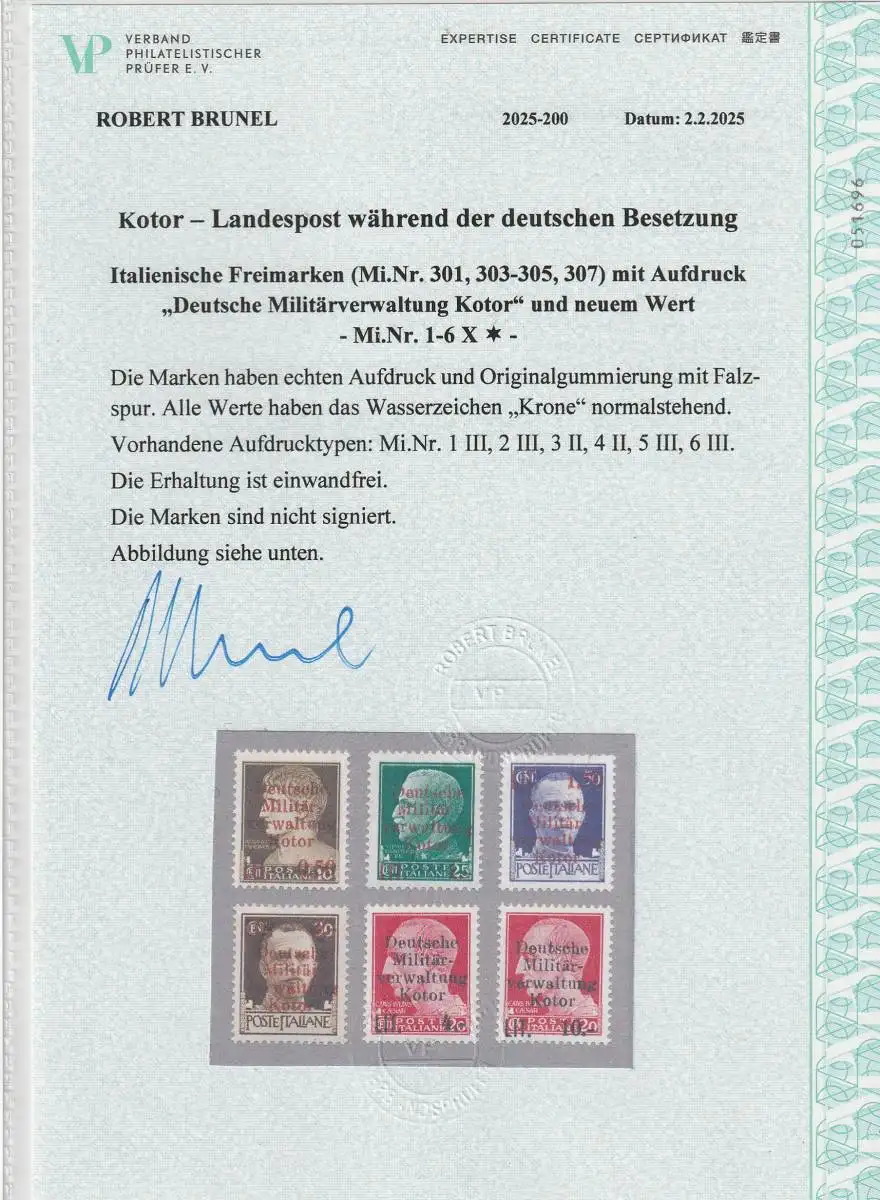 Kotor Aufdruckmarken 1 - 6 **, Attest Brunel