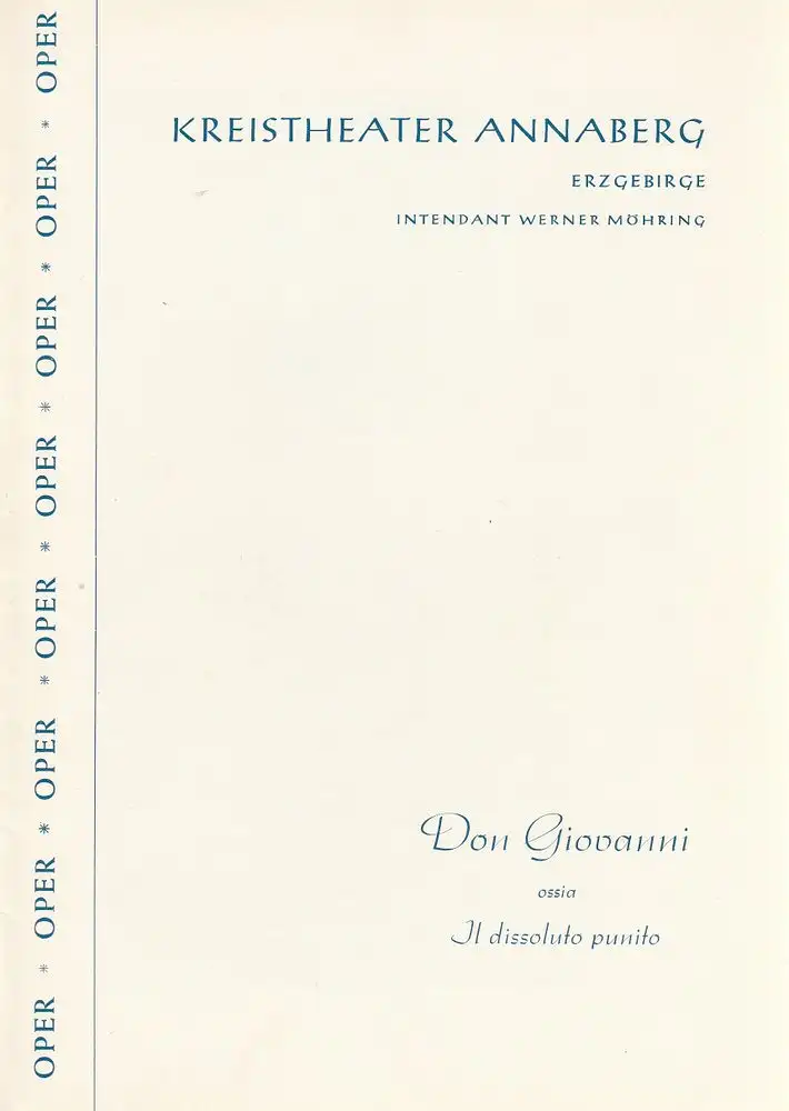 ossia Il dissoluto punito ( Der bestrafte Wüstling ). Dramma giocosa ( Heiteres Drama ) in zwei Akten vpn Lorenzo da Ponte, deutsch von Georg Schünemann. Musikalische Leitung: Erich Vietze. Inszenierung: Sepp Gottschling. Gesamtausstattung: Charlotte Gotthardt. Choreographie: Käte Schmidt-Müting. Mitwirkende: Gottfried Winter, Ruth Herrmann, Walter Uhlig, Wilhelm Brunner, Marianne Switala, u. a. - Schlüsselwörter: Theaterprogramm, Opernprogramm, Ballettprogramm, Musicalprogramm, Konzertprogramm, Theatermemorabilia, Programmhefte Sammlung, deutsche Theatergeschichte.