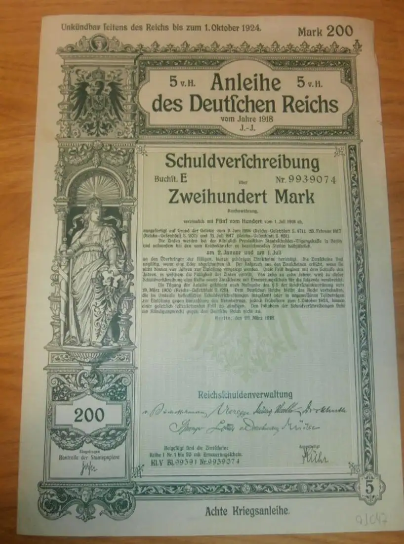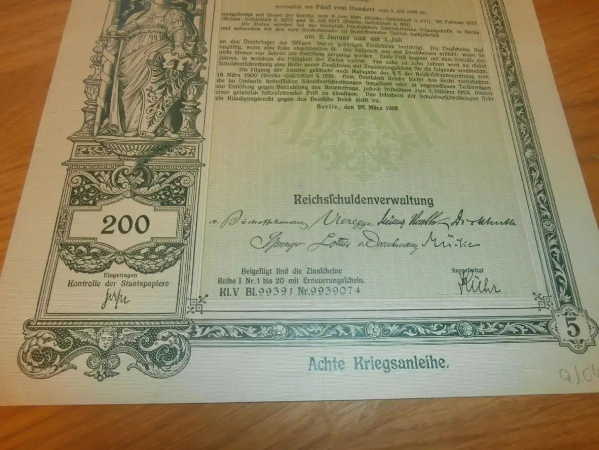 Kriegsanleihe - Schuldverschreibung , Zweihundert Mark , Deutsches Reich 1918 , Anleihe !!